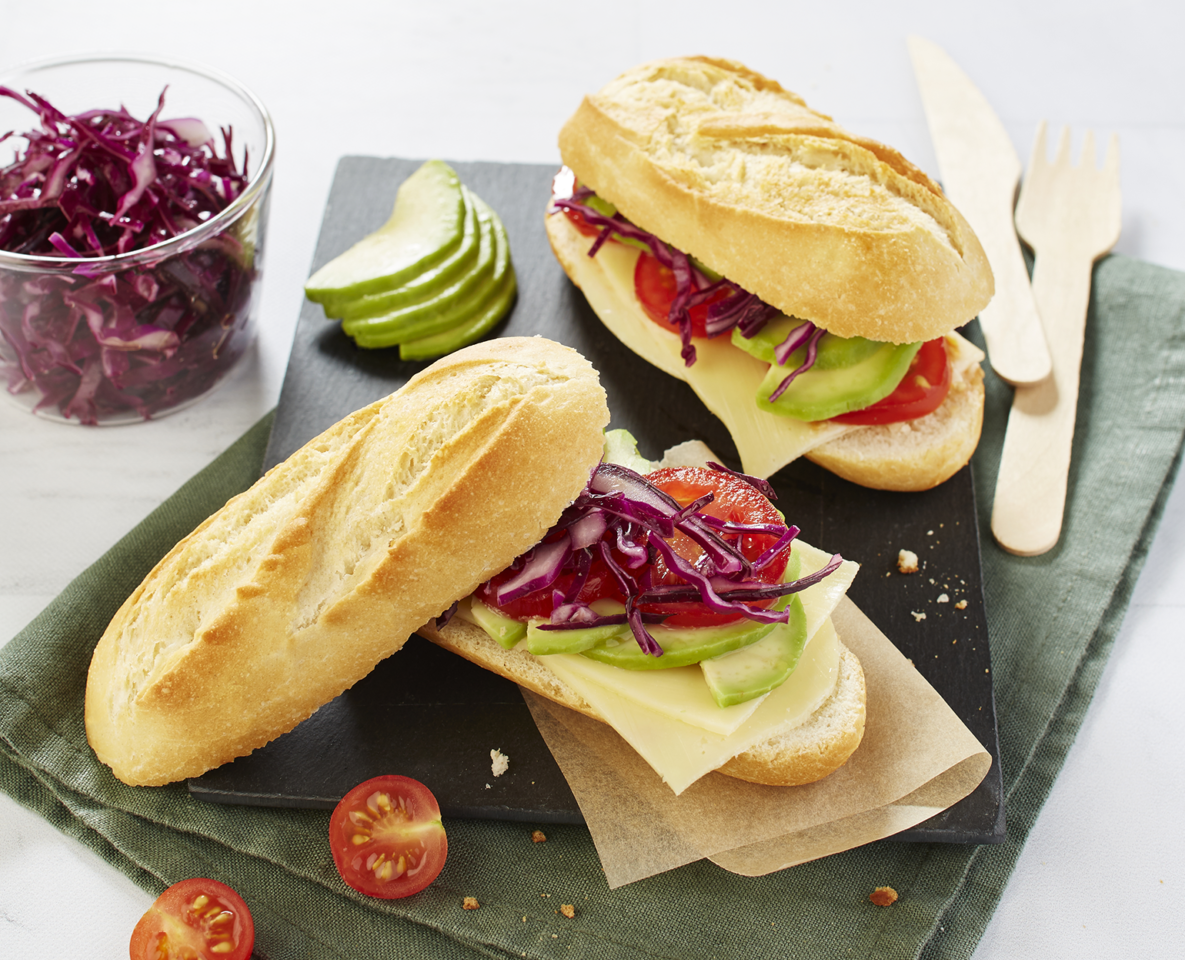 - Cut your French Mini Baguette in half, lengthwise, then add two slices of Gouda cheese, the avocado slices, tomato slices and red cabbage.